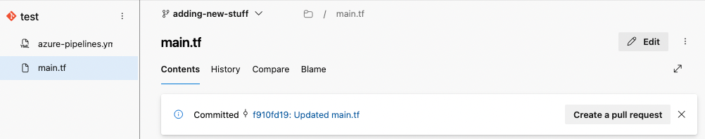main.tf(e.g., added/deleted resources). I save the file, then a Create pull request button appears: