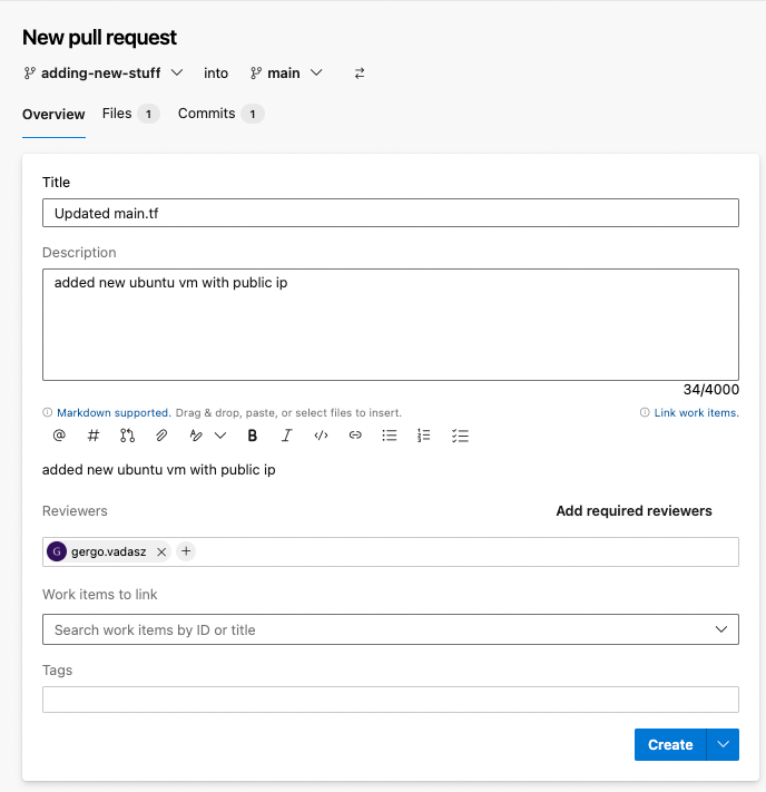 I create the pull request, which will merge my newly created branch into the main branch. I can add approvers if needed, so people will get notifications that their approval is needed.