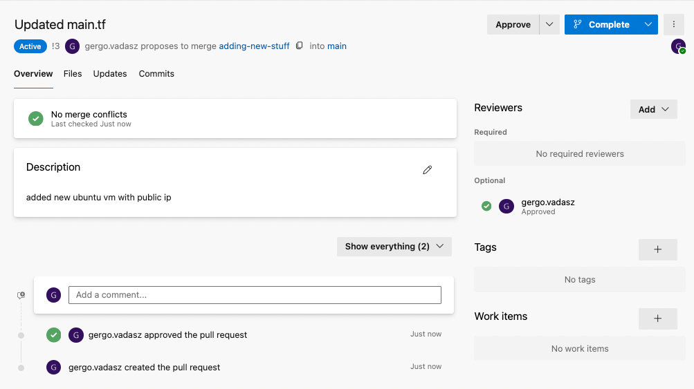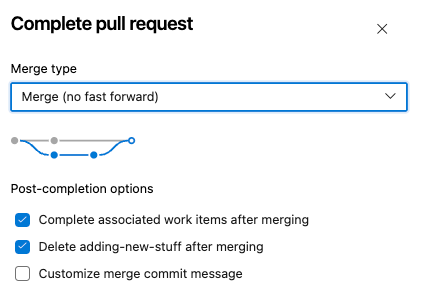 Once approved (since I was the reviewer), I clicked the Complete button, merging the new branch and its modifications into the main branch. The adding-new-stuff branch gets deleted with the merge automatically.