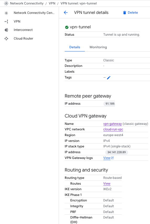 Once the on-prem vpn device is configured properly, the vpn tunnel should be up and running. We can test connectivity between our Cloud Run and the on-prem server.