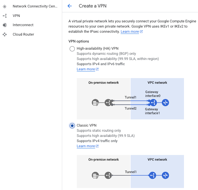 In this guide, we are focusing on a Classic VPN tunnel using static routing. While Google Cloud’s High Availability (HA) VPN is the standard for production environments requiring 99.99% uptime, the Classic option remains a popular choice for straightforward, "no-frills" connectivity.
