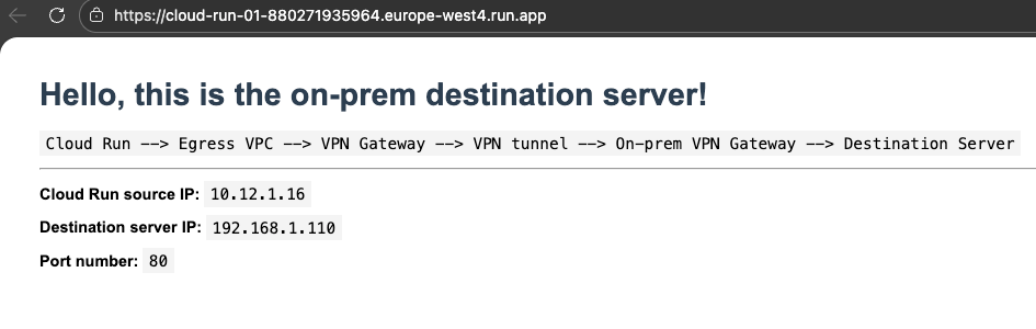 With the infrastructure in place, the final step is to validate that traffic can successfully traverse the path from the public internet, through Cloud Run, across the VPN, and into your on-premises environment.