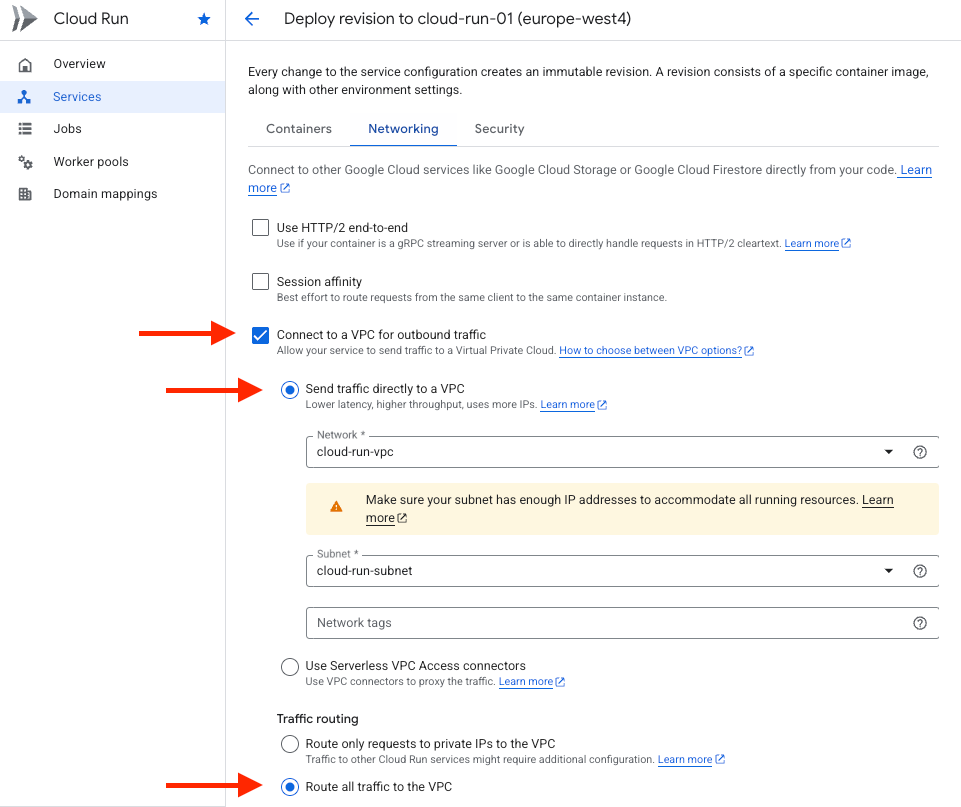To route your traffic correctly, you need to build a "bridge" between the managed Cloud Run environment and your private VPC. This is done using a feature called Direct VPC Egress (or the older Serverless VPC Access Connector, but Google recommends to use Direct VPC Egress).