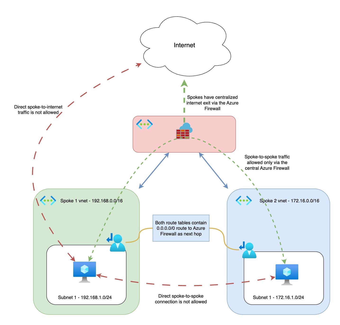 Each spoke subnet has a user-defined route (0.0.0.0/0) that points to the private IP of the Azure Firewall (next hop = Virtual Appliance). This forces all outbound traffic, whether to the internet or to other spokes, through the firewall.